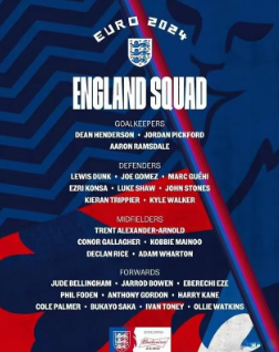 Par rapport à la liste primaire précédente, à l'exception de Madison et Curtis Jones, qui ont officiellement annoncé leur départ de l'équipe, Branthwaite, Trafford, Kuanza, Grealish et Maguire n'ont pas encore été sélectionnés. Peut être inclus dans la liste finale de 26 joueurs. Maguire, qui portait le maillot des Angleterre Euro 2024, a été perdu principalement à cause de blessures. Il avait déjà subi une blessure musculaire. Parce que l'Angleterre avait suffisamment de joueurs offensifs, Grealish, numéro 10 de Manchester City, a été perdu de manière inattendue. Gardiens : Dean Henderson (Crystal Palace), Pickford (Everton), Ramsdale (Arsenal) Défenseurs : Dunk (Brighton), Gomez (Liverpool), Gueye (Crystal Palace), Konsa (Villa), Kwansa (Liverpool), Luke Shaw (Manchester United), Stones (Manchester City), Trippier (Newcastle), Walker (Manchester City) Milieu de terrain : Trent Alexander-Arnold (Liverpool), Gallagher (Chelsea), Menu (Manchester United), Rice (Arsenal), Walton (Crystal Palace) Attaquants : Bellingham (Real Madrid), Bowen (West Ham), Eze (Crystal Palace), Foden (Manchester City), Anthony Gordon (Newcastle), Kane (Bayern), Palmer (Chelsea), Saka (Arsenal), Ivan Toney ( Brentford), Watkin (Aston Villa).